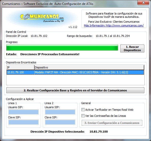 Al terminar el escaneo en la parte de "Dispositivos Encontrados" selecciona el dispositivo que desea configurar haciendo click sobre la IP y se activa el botón de "Realizar Configuración Base y Registro en el Servidor de Comunicanos", hacemos click sobre ello, la aplicación automáticamente prepara el dispositivo para realizar la sincronización con el servidor Comunicanos y aplicar los parametros recomendados para el uso con nuestra empresa, se debe esperar al menos 5 minutos mientras se realiza este proceso entre el servidor y el dispositivo (pueden parpadear todos los leds del ata, esto es normal).